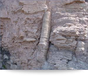 First photo: According to author, Ian Juby, “… the entire fossil story embedded in these cliffs is clearly one of chaos: The plants were broken and crushed. Many were strewn all over the place and lapped all over each other when found horizontal.” Second photo: Inverted polystrate tree.